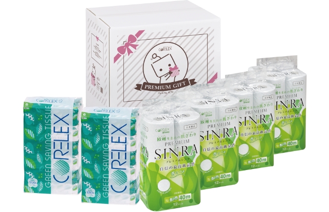 トイレットロールとティシューがセットになったギフトBOX。贈り物におすすめなプレミアムギフトは、最高級品質を揃えたセットです。